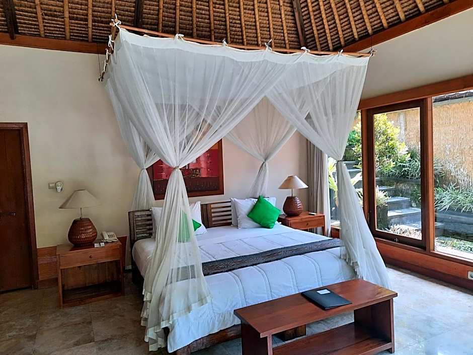 This villa features traditional Balinese design and a private outdoor pool, which offers more space. It is also fitted with air conditioning, a separated living area with flat-screen cable TV, a dining area.
